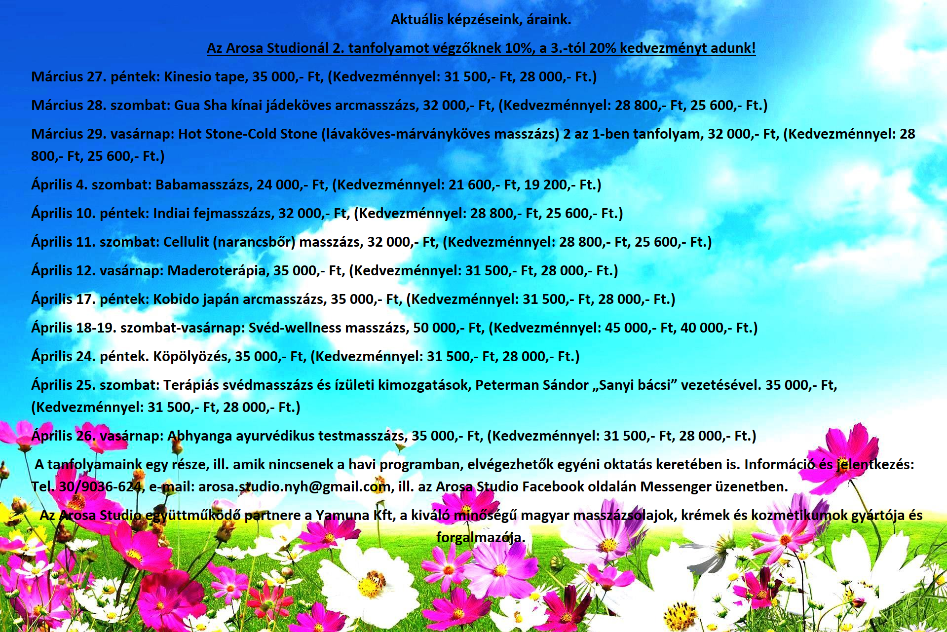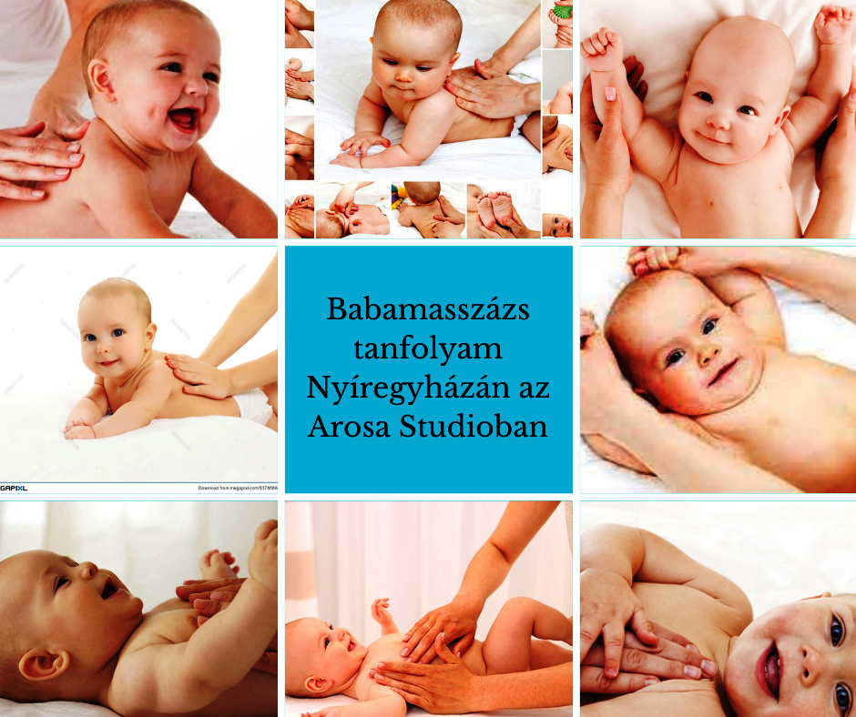Figyelem! Hamarosan újra babamasszázs képzést tartunk Nyíregyházán az Arosa Studioban! Időpont: 2026. április 4. szombat 10.00 órától.1 napos intenzív gyakorlatorientált képzés. A végzett tanulók Kormányhivatal által regisztrált tanúsítványt, és heti 1 alkalommal ingyenes gyakorlási és konzultációs lehetőséget kapnak, ill. gyakorolhatnak a későbbi tanfolyamokon. Ár: 24 000,- Ft. (Kedvezménnyel: 21 600 Ft, ill. 19 200,- Ft.)A képzést kisbabás szülőknek, kismamáknak, ill. ifjú nagymamáknak ajánljuk, akik a legjobbat szeretnék a gyermeküknek, kis unokájuknak. A babamasszázs jótékony hatásai: Segíti a baba izomzatának fejlődését. Segíti a mozgáskoordináció kialakulását. Segít a napi ritmus kialakításában. Segíti az étvágy fokozását. Enyhíti a hasfájást. Szorosabbá teszi a baba-szülő kapcsolatot. Erősíti a baba biztonságérzetét, lelki stabilitását, segíti a nyugodt alvást, jótékony hatása van hasfájás esetén. A képzés során a résztvevők megismerik a babamasszázs elméletét és gyakorlati fogásait, az ellenjavallatokat. Az oktatás természetesen nem kisbabákon történik, hanem méretarányos játékbabákon.: 30/9036-624, ill. Messenger üzenetben.