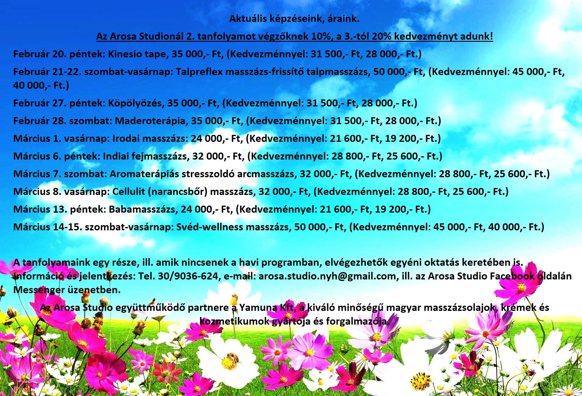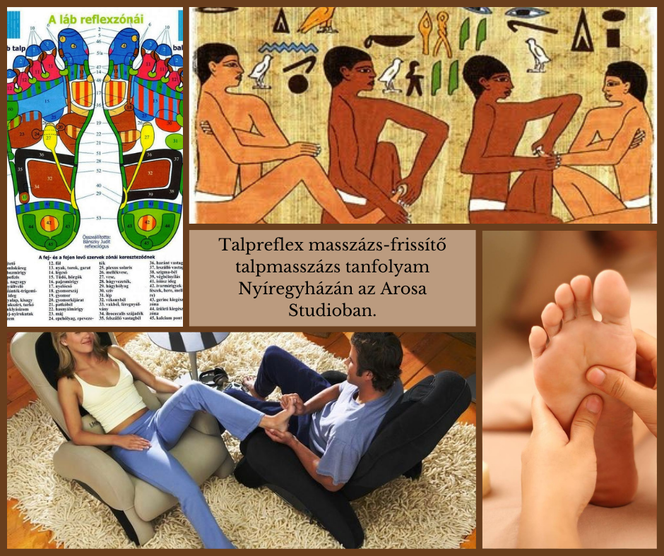 Talpreflex masszázs-frissítő talpmasszázs tanfolyam Nyíregyházán az Arosa Studio masszőr iskolában. Időpont: 2026. február 21-22. szombat-vasárnap.2 napos intenzív gyakorlatorientált képzés, Kormányhivatal által regisztrált tanúsítvánnyal, igény esetén angol-német nyelven is. A tanulók heti 1 alkalommal keddi napokon ingyenes gyakorlási lehetőséget kapnak, illetve ingyenesen gyakorolhatnak a következő talpmasszázs tanfolyamokon. Ár: 50 000,- Ft. (Kedvezménnyel: 45 000,- Ft, ill. 40 000,- Ft.) A talpmasszázs ismerete a masszőrnek napjainkban szinte mindenhol elvárt, a legfontosabb kiegészítő képesítés a klasszikus -svéd masszázson felül. Külföldi munkavállalásnál, szállodákban, wellness létesítményekben különösen fontos az ismerete, elengedhetetlen. A képzés során a tanulók megismerik a talpreflex masszázs hatásmechanizmusát, a reflexzónák elhelyezkedését, és a talpmasszázs speciális fogásait, ezen felül a frissítő talpmasszázs technikáit is.Jelentkezés a 30/9036-624-es számon.